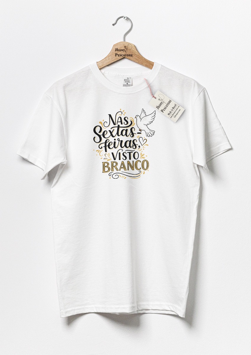 Apresentamos a exclusiva Camiseta de Algodão Premium com Estampa AS SEXTAS-FEIRAS VISTO BRANCO da Jhony Pescatore, a escolha perfeita para quem busca qualidade e autenticidade em cada detalhe.